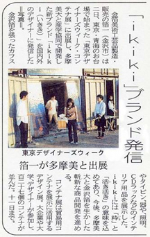 2004年 東京デザイナーズウィークに出店 「東京デザイナーズウィーク・コンテナ展」に出展し、多摩美大と産学協同で開発した新ブランド「ikiki(いきき)」を国内外のデザイナーに発信した。 2022年1月23日 投稿先 2000年代 展示会 ← 過去の投稿へ 次の投稿へ → コメントを残す コメントをキャンセルメールアドレスが公開されることはありません。 ※ が付いている欄は必須項目ですコメント ※ 名前 ※ メール ※ サイト 次回のコメントで使用するためブラウザーに自分の名前、メールアドレス、サイトを保存する。